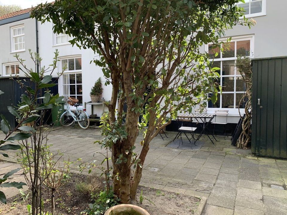 Lovely, secluded garden with bicycle shed in the front, entrance, small hall, toilet, living area with new modern, open kitchen.