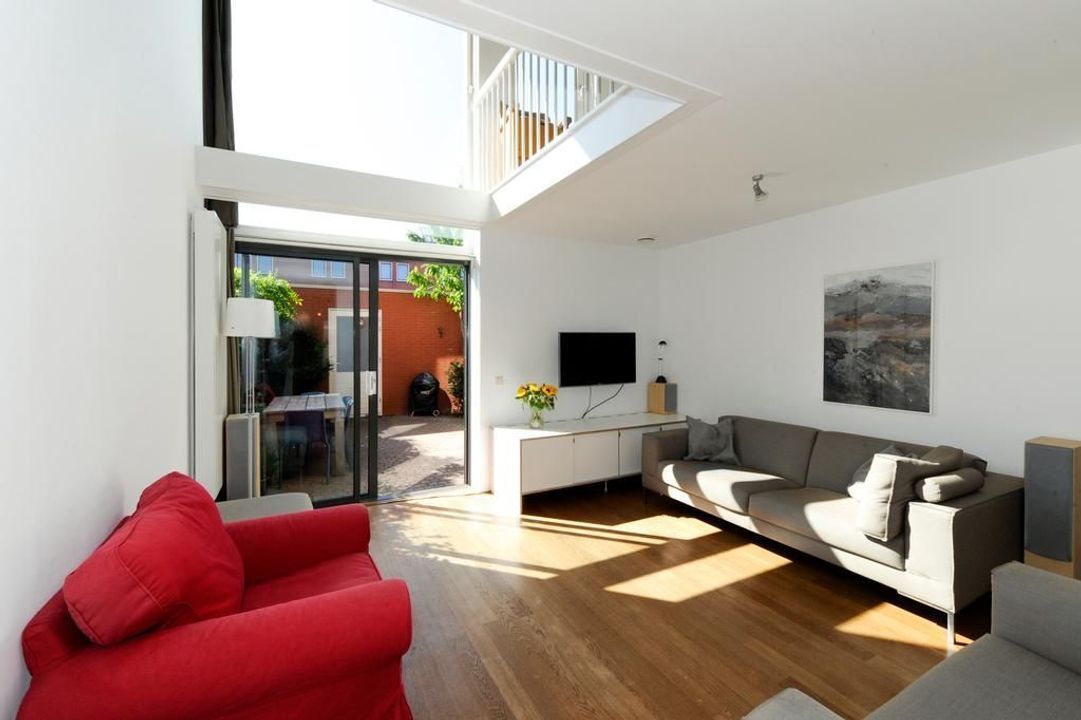 Entree via voortuintje, hal met garderobe-mogelijkheid, meterkast met uitgebreide elektra installatie, modern toilet met fontein. De tuingerichte woonkamer (ca. 4.40x4.20) heeft een prettige lichtinval door een hoge raampartij van (ca. 6 meter hoog) middels een vide met een open verbinding naar de hoger gelegen slaap/werkkamer.